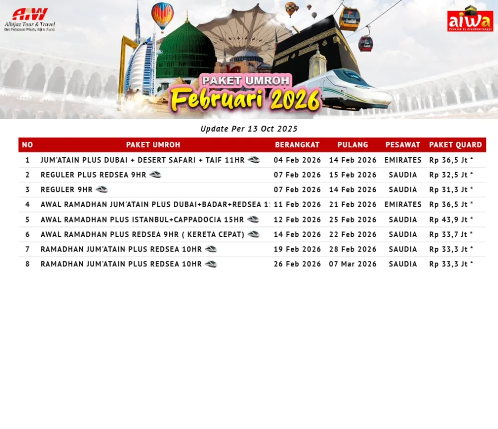 Siap untuk umroh di bulan Februari 2026 bersama Alhijaz? Jangan sampai kehabisan dan lewatkan kesempatan ini yaa! Yuk rencanakan keberangkatan umroh bersama keluarga