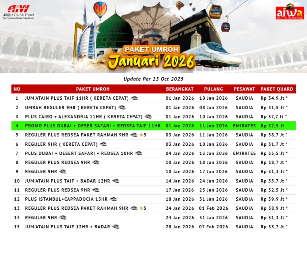 Siap untuk umroh di bulan Januari 2026 bersama Alhijaz? Jangan sampai kehabisan dan lewatkan kesempatan ini yaa! Yuk rencanakan keberangkatan umroh bersama keluarga